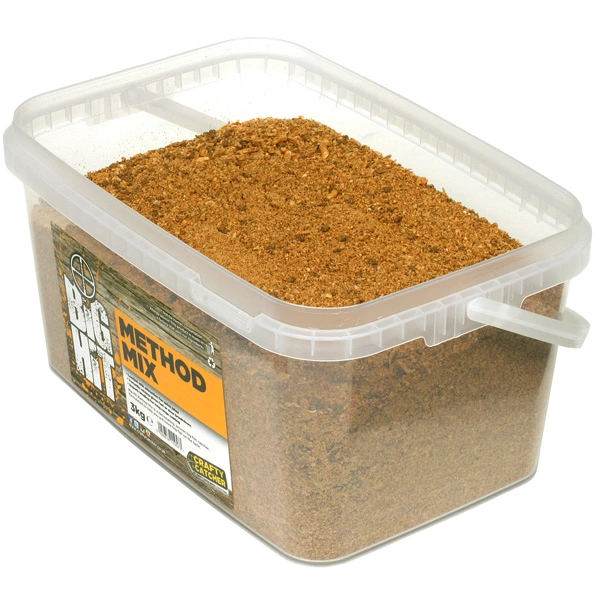 Loaded with attraction for quick bits, the versatile groundbait can be mixed to give a fast or slow breakdown. With superb binding for long range casting the Big Hit Method Mix is a devastating proven big fish catcher that targets fish at any range. This adaptable mix can be customised with up to 20% extra additives and liquids without affecting performance. 3kg bucket.