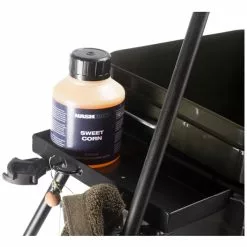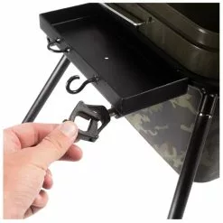 A rectangular metal side tray allows you to keep finger stalls, pop up pots and rig tools handy at all times, complete with a metal retaining loop to hang numbers of pre-tied and ready baited rigs for when the action is hectic. A hanging hook takes a hand towel or even air dry bags to keep boilies close to hand for throwing stick work.
