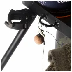 A rectangular metal side tray allows you to keep finger stalls, pop up pots and rig tools handy at all times, complete with a metal retaining loop to hang numbers of pre-tied and ready baited rigs for when the action is hectic. A hanging hook takes a hand towel or even air dry bags to keep boilies close to hand for throwing stick work.