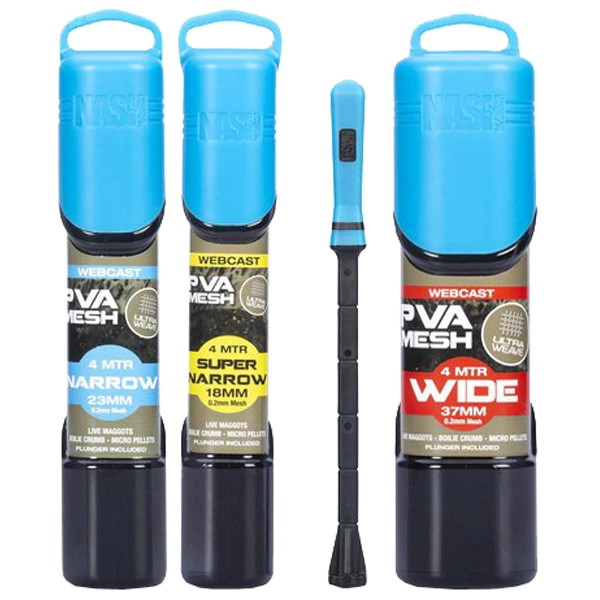 Three diameters of loading tubes satisfy any feeding requirement from tiny sticks when scratching for bites to large mesh bags when carp are feeding hard. Super Narrow – 18mm, Narrow – 23mm and Wide – 37mm.For the Nash Webcast Ultra Weave PVA Refill – 3m see product code 24016.